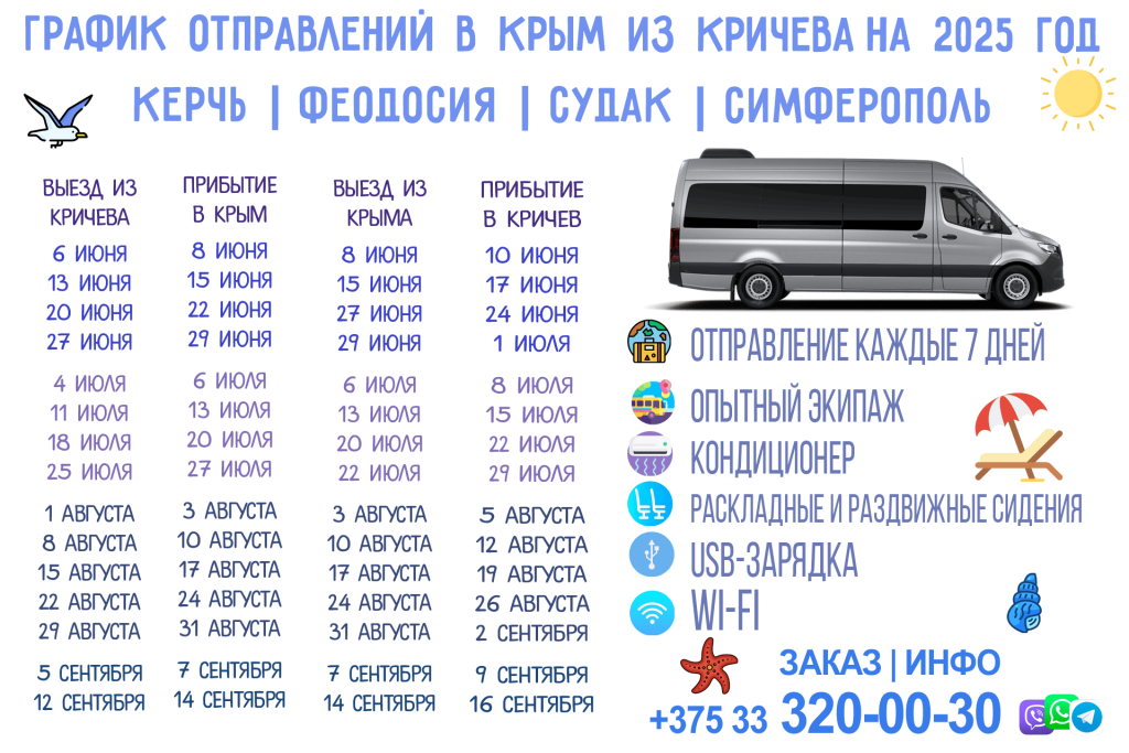 Путешествуйте с нами на комфортабельном автобусе по маршруту Кричев – Керчь → Феодосия → Судак → Симферополь