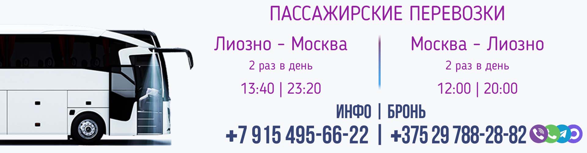 Комфортабельный автобус в Москву из Лиозно и обратно. Выезд из Лиозно в 13:40 и 23:20. Выезд из Москвы в 12:00 и 20:00