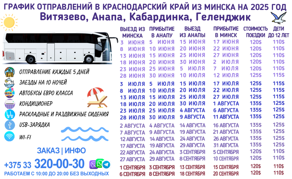 Минск — Анапа – Геленджик автобус | график на 2025 год | выезд каждые 5 дней