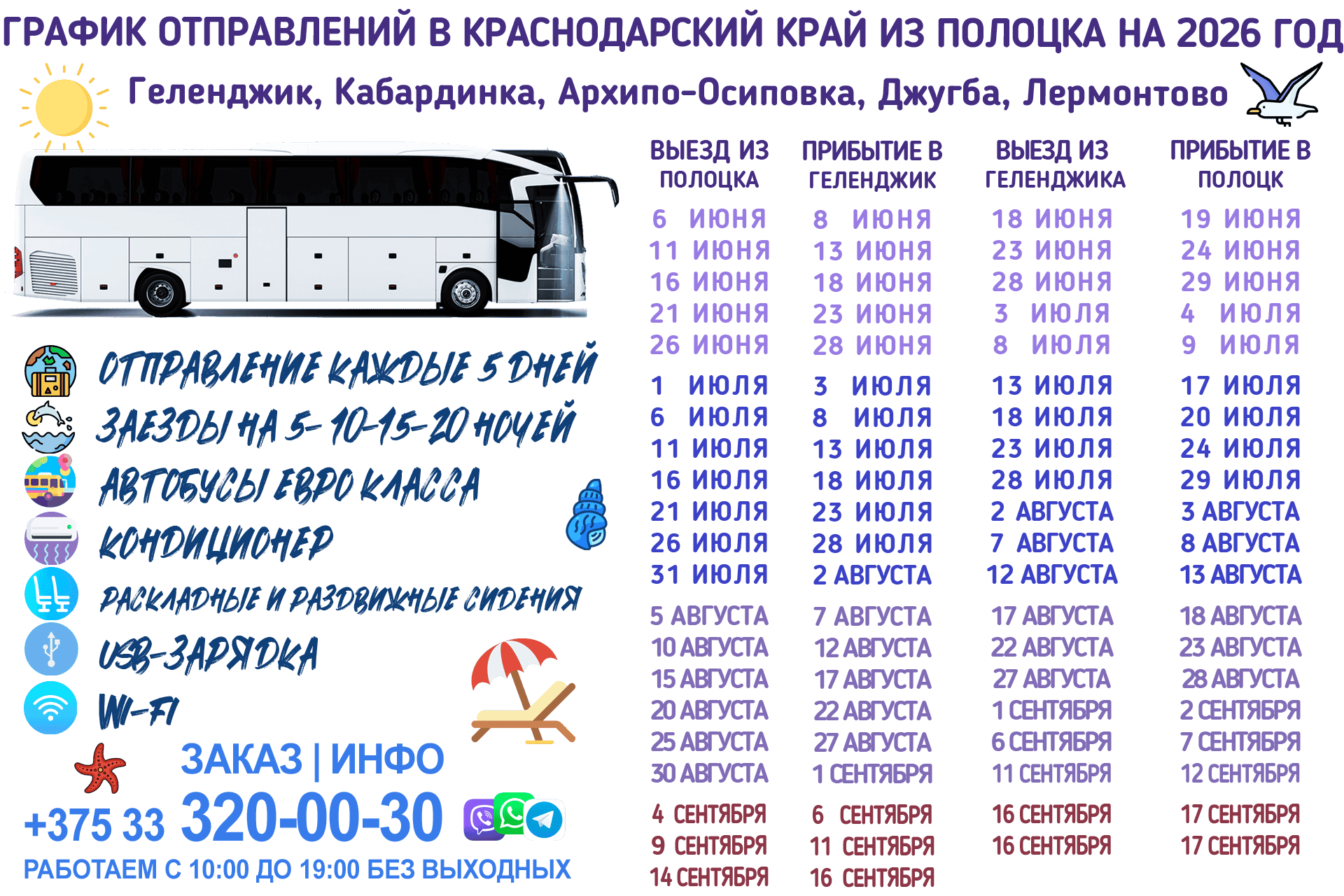 Полоцк — Геленджик – Кабардинка автобус | выезд каждые 5 дней | график на 2026 год